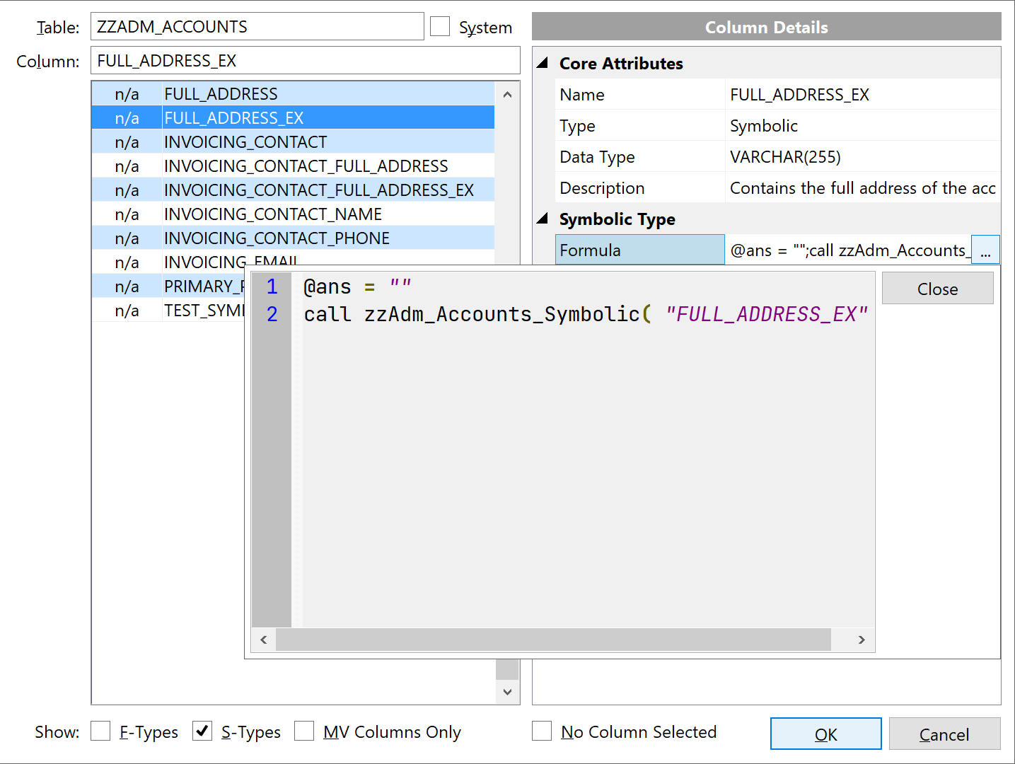 The Description, Validation, Heading and Formula attributes all have their own sub-dialog boxes to display their full details.